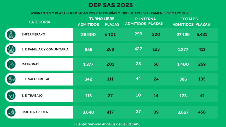 El sábado 17 de mayo se celebrarán los exámenes del concurso oposición de la Oferta Pública de Empleo del Servicio Andaluz de Salud (SAS) 2025 para las que se han inscrito más de 34.000 Enfermeras, Enfermeras Especialistas (Familiar y Comunitaria, Matrona, Salud Mental y Trabajo) y Fisioterapeutas entre otras categorías.