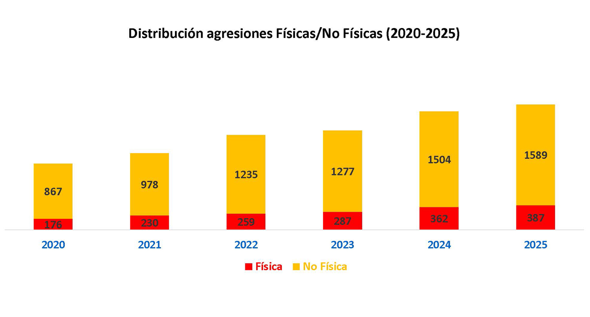 Más detalles sobre el último periodo de estudio, esto es el año 2025, indican por el tipo de agresión, 387 fueron físicas y 1.589 no físicas.