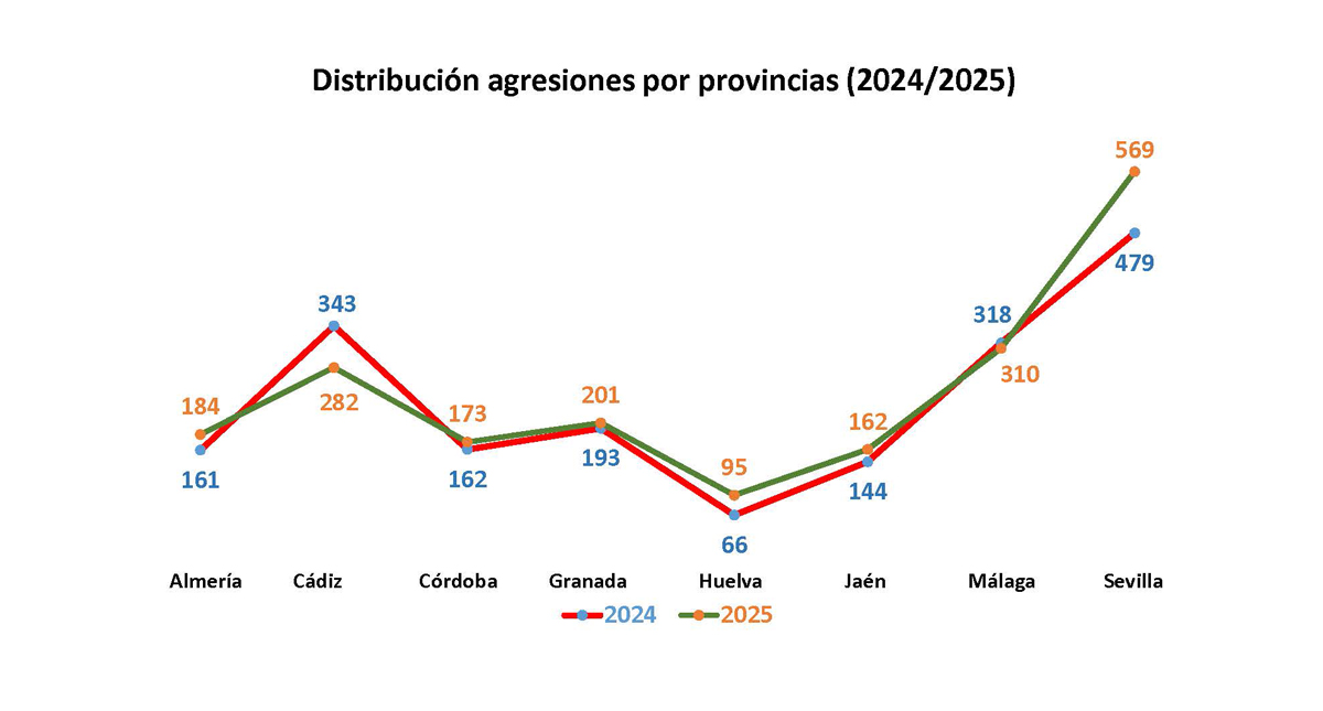 Por provincias, Sevilla lidera el número de ataques con 569 (107 físicas y 462 no físicas), seguida de Málaga con 310 (66 físicas y 244 no físicas), Cádiz con 282 (45 físicas y 237 no físicas), Granada con 201 (51 físicas y 150 no físicas), Almería con 184 (33 físicas y 151 no físicas), Córdoba con 173 (37 físicas y 136 no físicas), Jaén con 162 (29 físicas y 133 no físicas) y Huelva con 95 (19 físicas y 76 no físicas).